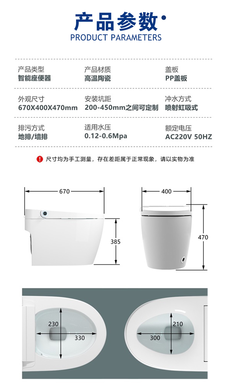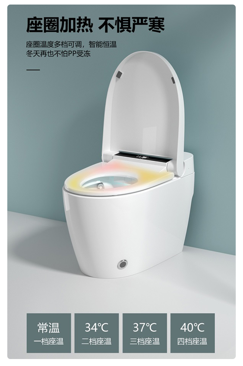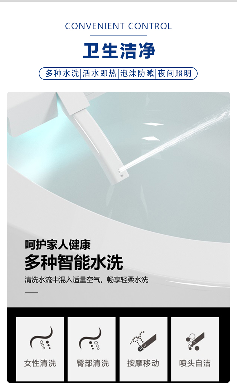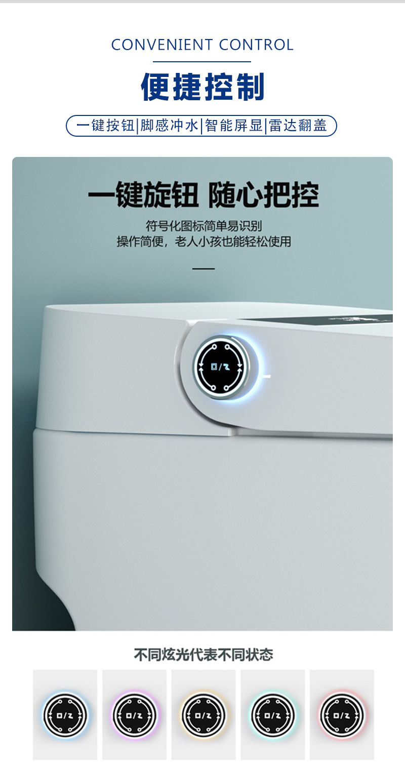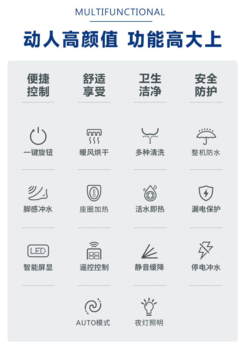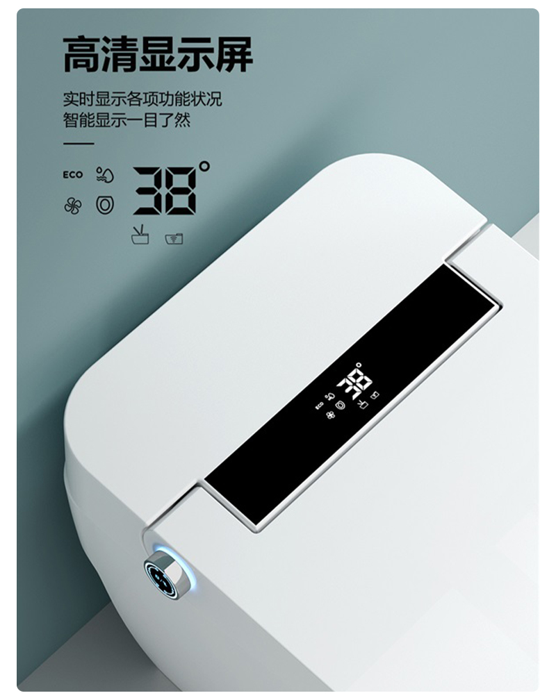 脚感冲水,一键按钮,LED显示屏,座位调节,暖风烘干,夜灯照明,IPX4防水淋,喷杆自洁,防菌,坐温,水温可调